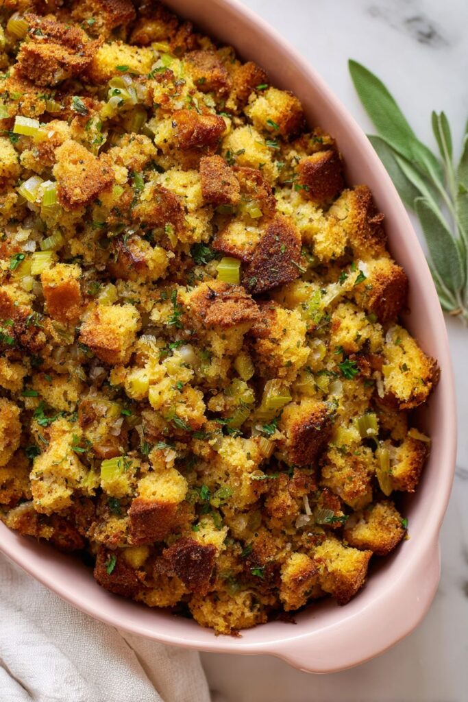- Rich, savory flavors – The combination of sage sausage, fresh herbs, and homemade cornbread creates layers of taste that pair perfectly with turkey, ham, or any holiday main dish.