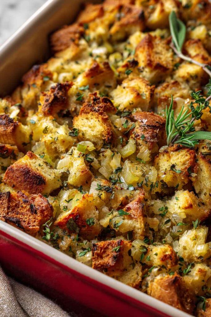 - Remove the stuffing from the oven and let it rest for 10 minutes before serving. This allows the structure to set slightly and makes it easier to portion. Just before serving, sprinkle the top generously with fresh herbs like sage, parsley, or rosemary for a burst of color and fresh flavor.
