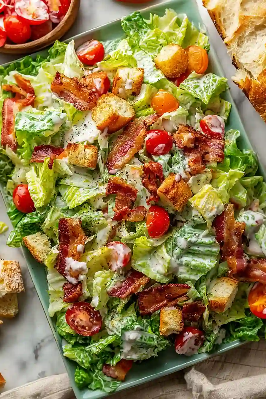 - Place the chopped lettuce in a large serving bowl or on individual plates. Arrange the diced tomatoes, crispy bacon, and croutons over the lettuce. Pour the creamy herb dressing from Step 1 over the salad and toss gently but thoroughly until all components are evenly coated. I recommend tossing the salad just before serving to keep the croutons as crispy as possible—this dish is all about the contrast between the tender greens, juicy tomatoes, and crispy elements!