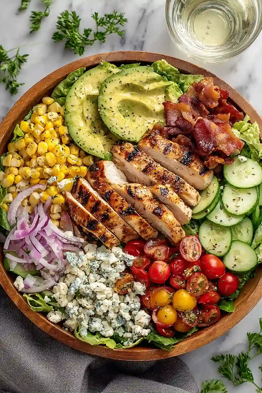 - Arrange the sliced grilled chicken on top of the dressed lettuce, then distribute the halved cherry tomatoes, diced cucumber, corn kernels, thinly sliced red onion, crumbled bacon, and crumbled blue cheese evenly across the salad. Slice the avocado just before serving to prevent browning, then arrange the slices on top. Drizzle any remaining dressing over the entire salad or serve it on the side so diners can add as much as they prefer. I always keep the avocado separate until the last moment—even a few minutes of exposure to air can cause browning, so this timing is crucial for both appearance and texture.