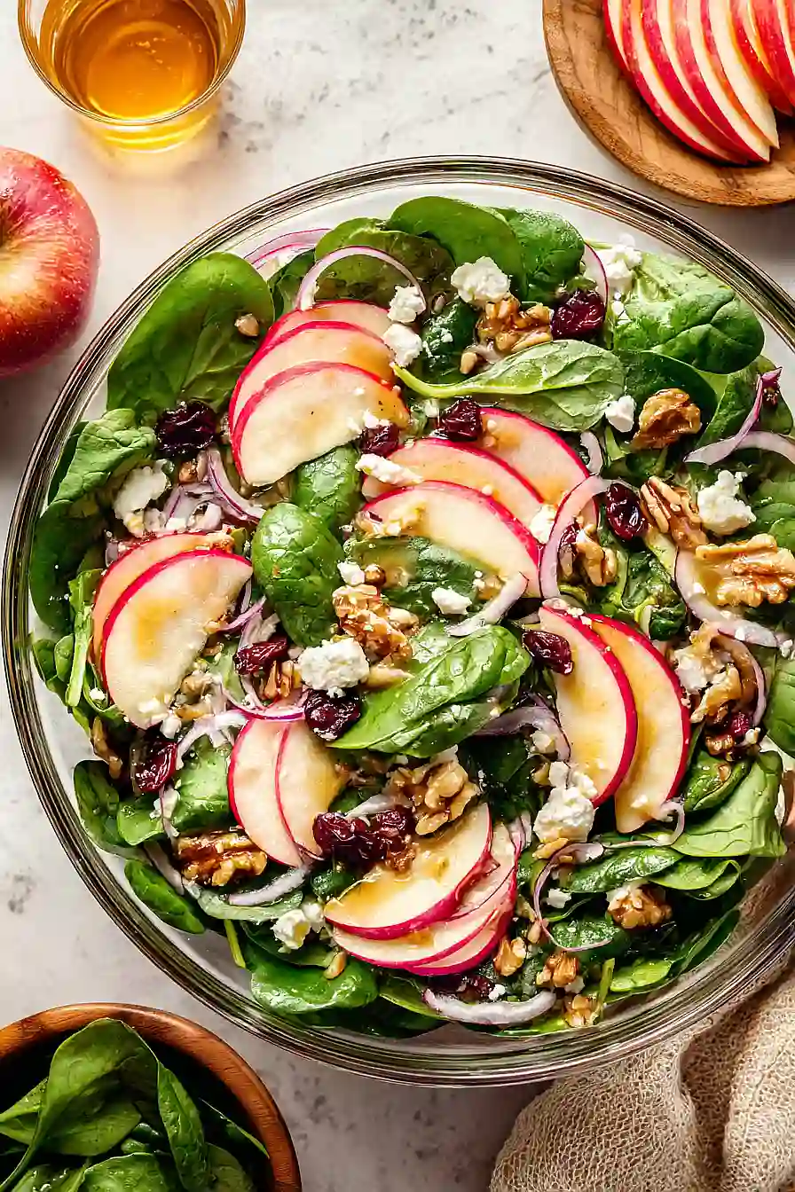 Store Components: This salad is best enjoyed fresh, but you can prep the ingredients ahead of time. Keep the washed spinach, sliced apples (toss with a bit of lemon juice to prevent browning), chopped onion, and crumbled goat cheese in separate containers in the fridge for up to 2 days. Store the dressing in a jar and give it a good shake before using.