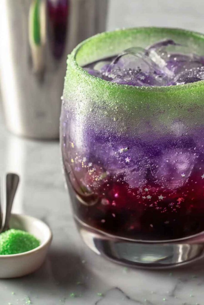 Dip the rim of your glass into the corn syrup first, coating it evenly, then immediately dip it into the green sugar to create a vibrant witch-themed rim.