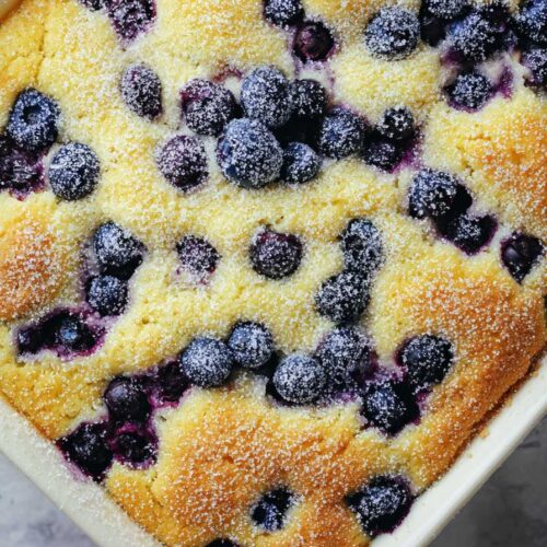 This cake is absolutely delicious. I used frozen blueberries and they worked perfectly. This recipe will be a breakfast staple on the weekend. I’m looking forward to baking it up as muffins.