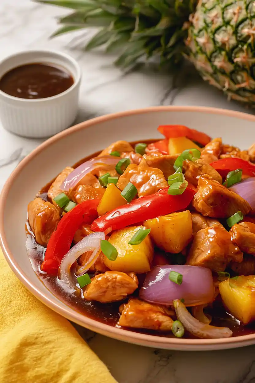 • Transfer the chicken and pineapple mixture to a serving dish or individual bowls. Thinly slice the green onions on a bias for a professional presentation and scatter them over the top just before serving. The fresh green onion garnish adds a bright contrast to the sweet and smoky BBQ flavors.
