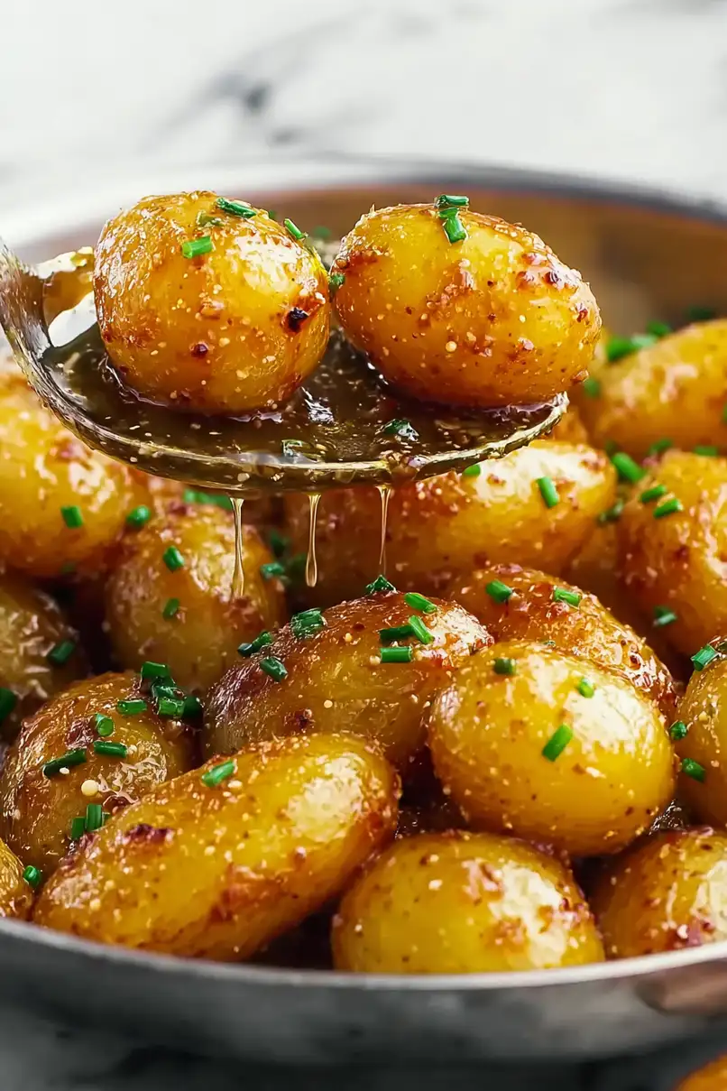 The brief cooking time ensures the potatoes stay tender while the glaze becomes slightly sticky and caramelized on the surface.