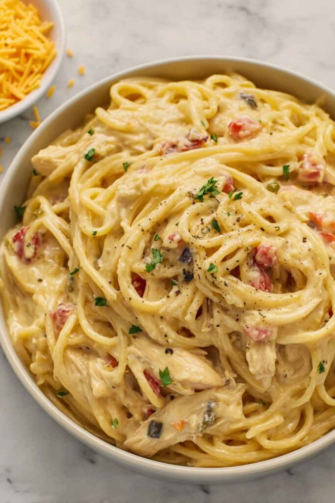- While the cheese is melting in the slow cooker (or while you’re waiting for the chicken to finish cooking if you’re ahead of schedule), bring a large pot of salted water to a boil. Add the spaghetti and cook according to package directions until it reaches al dente texture—this is crucial because the pasta will continue to soften slightly when mixed with the warm sauce. Drain the pasta thoroughly in a colander, shaking off excess water. Add the cooked spaghetti to the creamy chicken mixture in the slow cooker and toss everything together until the pasta is evenly coated with the sauce. The dish is now ready to serve directly from the slow cooker, or transfer to serving bowls.